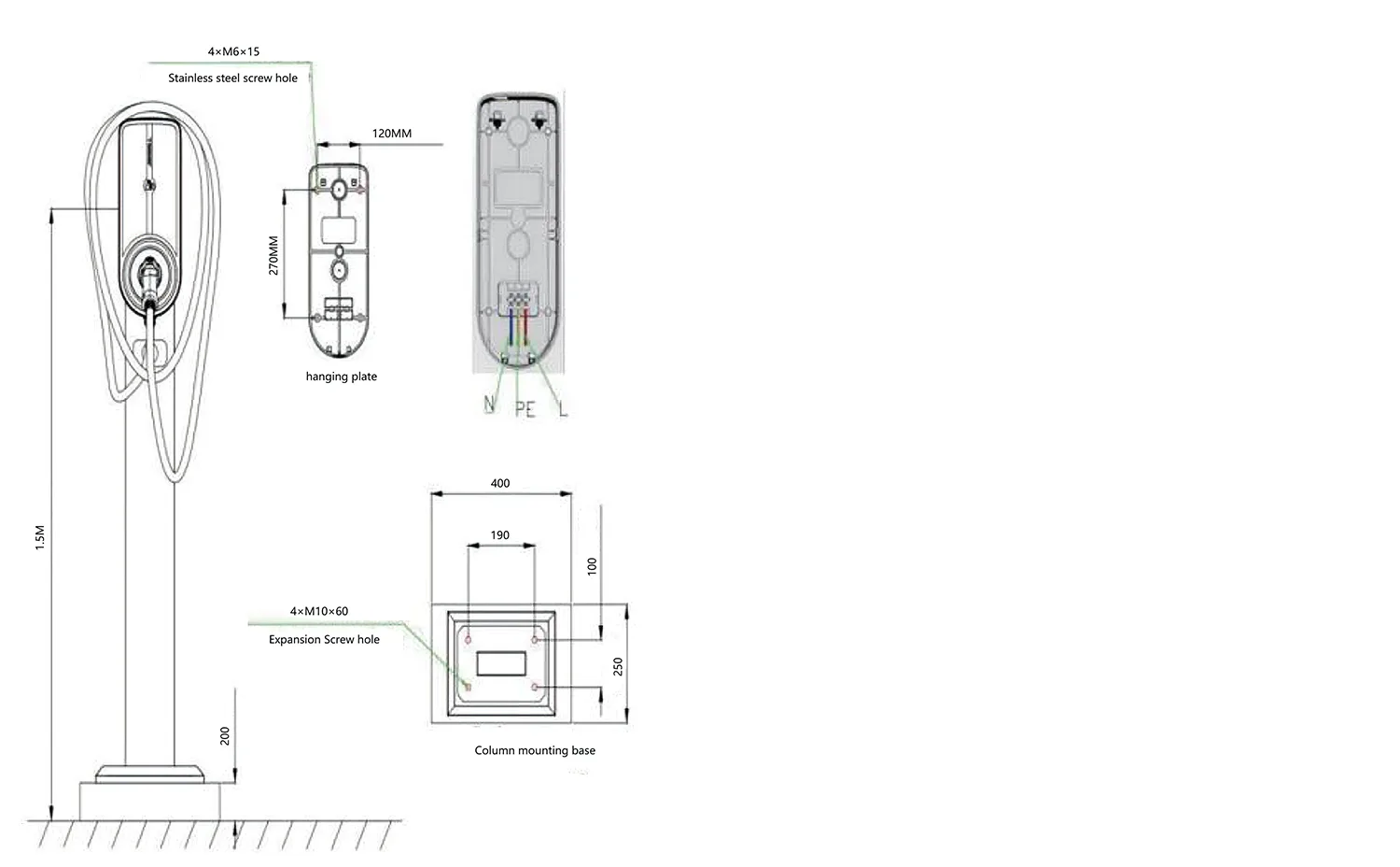 1) အားသွင်းပုံအတွက် ကွန်ကရစ်အုတ်မြစ်သည် C25 ခိုင်ခံ့မှုရှိသင့်သည်။ မြေအောက်အပိုင်းသည် 400 မီလီမီတာနှင့် မြေပြင်အထက်အပိုင်းသည် 200 မီလီမီတာဖြစ်သည်။ ကွန်ကရစ်အတိုင်းအတာမှာ 400*250mm ဖြစ်သည်။ ဖောင်ဒေးရှင်းသည် အလယ်ဗဟိုတွင် မြှုပ်ထားသော ထွက်ပေါက်ပိုက်တစ်ခု ရှိသင့်ပြီး ဖောင်ဒေးရှင်းတွင် M10*60 ချဲ့ထွင်ထားသော ဘော်လီ ၄ ခုကို တပ်ဆင်သင့်သည်။